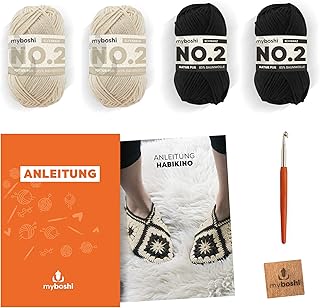 myboshi Häkelset Hausschuhe Habikino, inkl No.2 Wolle, Nadel und Anleitung, für Babys und Amigurumi, DIY-Häkelpaket, 85% Baumwolle, 15% Kapok Elfenbein, Schwarz mit Häkelnadel