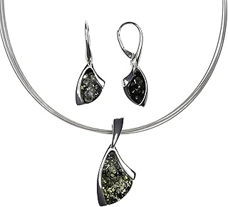 Bernstein Schmuckset, modernes grünes Bernstein Schmuck-Set von Artisana-Schmuck, Anhänger und Ohrringe aus 925/000 Sterling Silber rhodiniert und Bernstein, Halsreif aus 6-fach Edelstahldraht