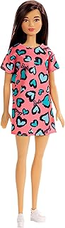 Barbie GHW46 - Chic Barbie Puppe (brünett) im pinken Kleid mit blauem Herzaufdruck und Schuhen, ab 3 Jahren